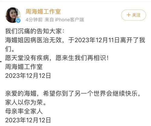 网友爆料周海媚离世视频,周海媚离世,演艺界再失一位璀璨明星